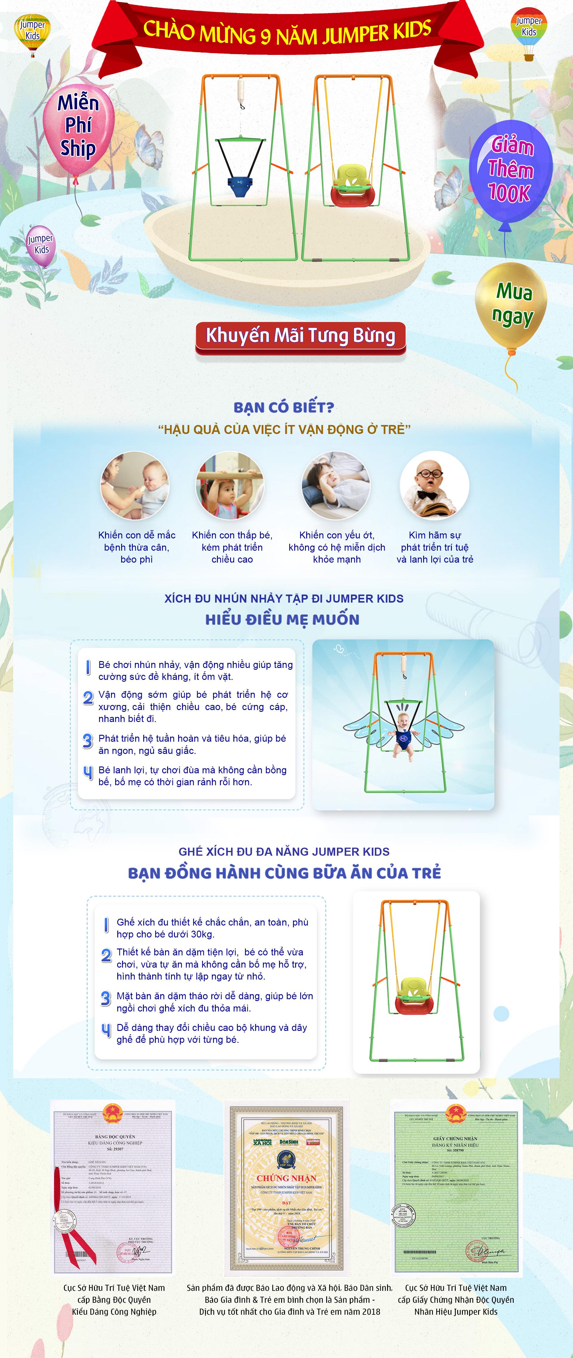 Ở thành phố, các bé hầu như có rất ít không gian để vận động, vui chơi. May mắn tôi biết đến sản phẩm Xích Đu Jumper Kids. Tôi mua ngay về cho cháu chơi. Rất hài lòng là sản phẩm tốt, chắc chắn, bé nhún nhảy vận động nhiều tăng sức đề kháng, nhanh biết đi. Xích Đu Jumper Kids là giải pháp tuyệt vời cho các bé