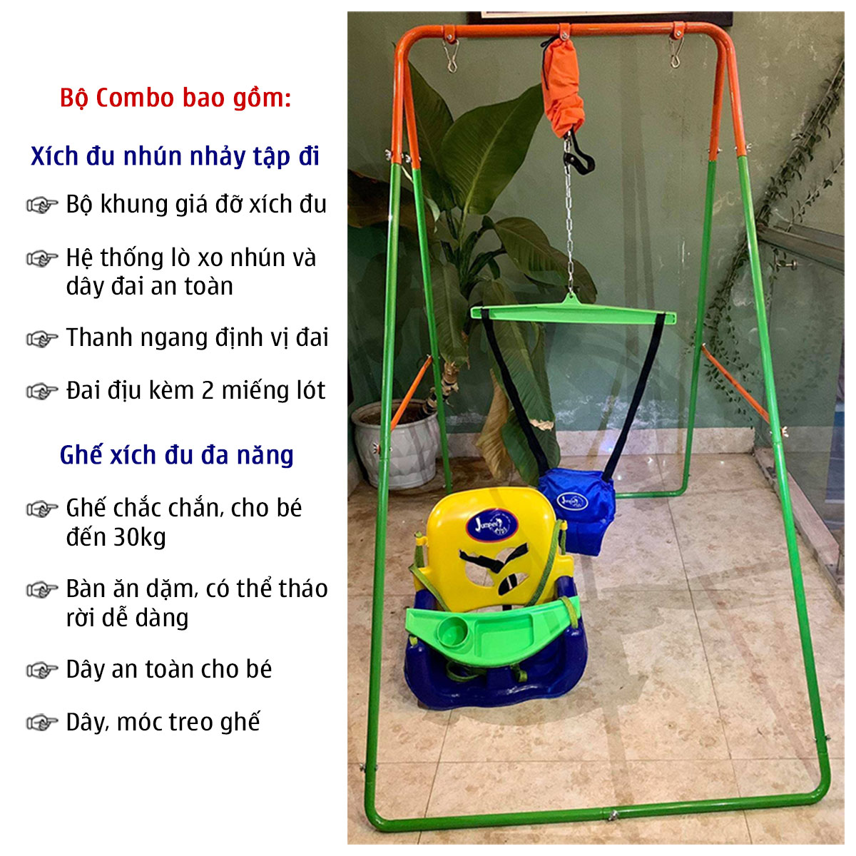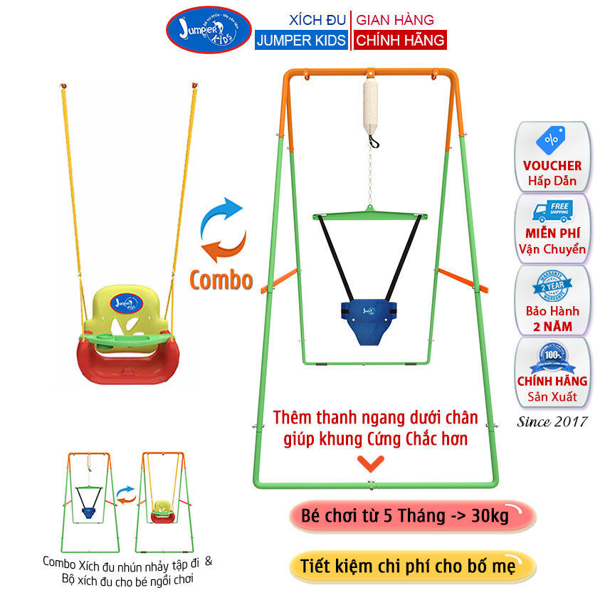 Bộ Combo đa năng Xích đu Jumper Kids gồm xích đu nhún nhảy tập đi với khung cứng chắc (có thêm 2 thanh ngang dưới chân) và ghế xích đu tích hợp bàn ăn dặm, phù hợp cho bé từ 5 tháng (bé cứng cổ bắt đầu chơi được) đến 30kg.