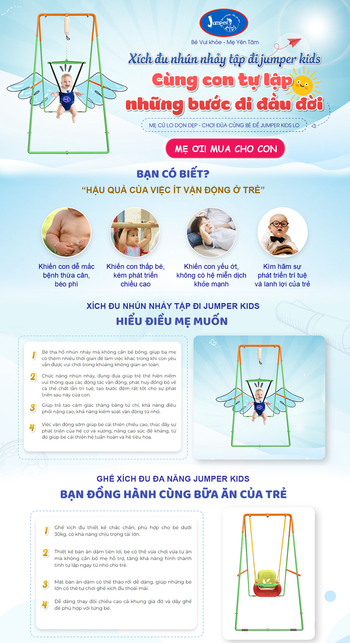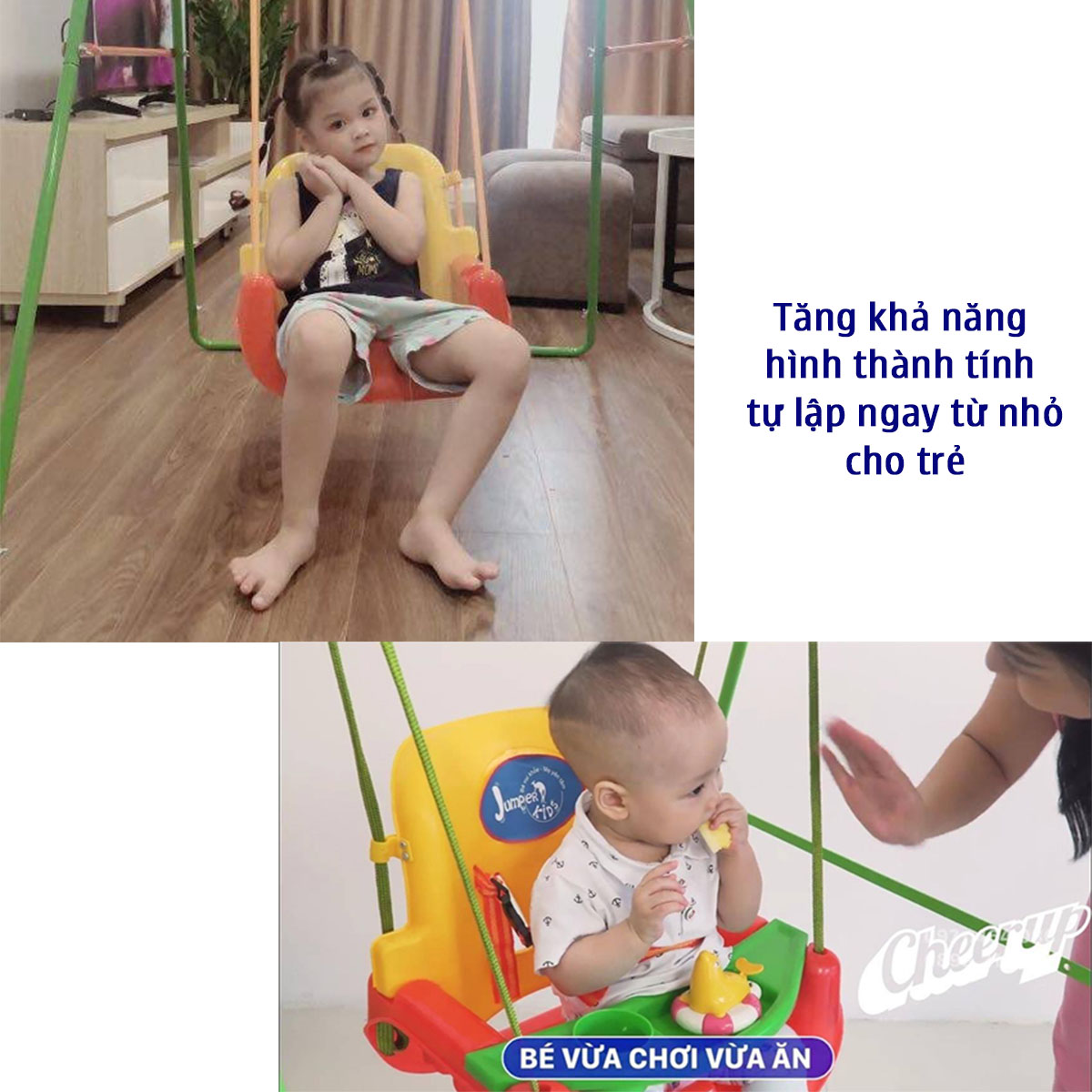 Với chức năng nhún nhảy và đung đưa, xích đu cho bé tạo cảm giác thăng bằng, giúp bé tập đi nhanh hơn, nâng cao sức đề kháng, khả năng vận động và phát triển toàn diện.