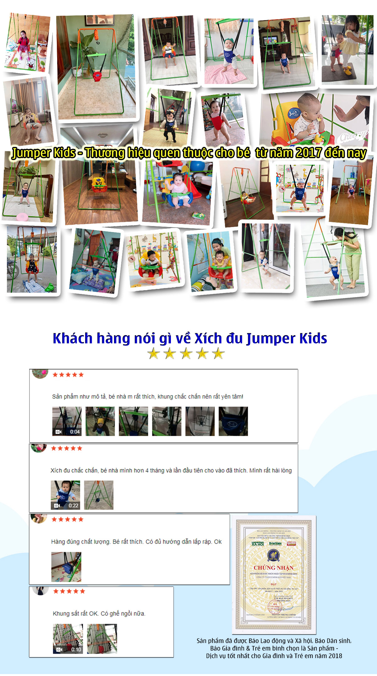 Công ty TNHH Jumper Kids Việt Nam luôn đặt tiêu chí chất lượng và an toàn tuyệt đối cho các bé lên hàng đầu. Các sản phẩm Xích Đu Jumper Kids được sản xuất theo quy trình kiểm tra nghiêm ngặt với các tiêu chuẩn kỹ thuật khắt khe, đảm bảo an toàn tối đa khi sử dụng.