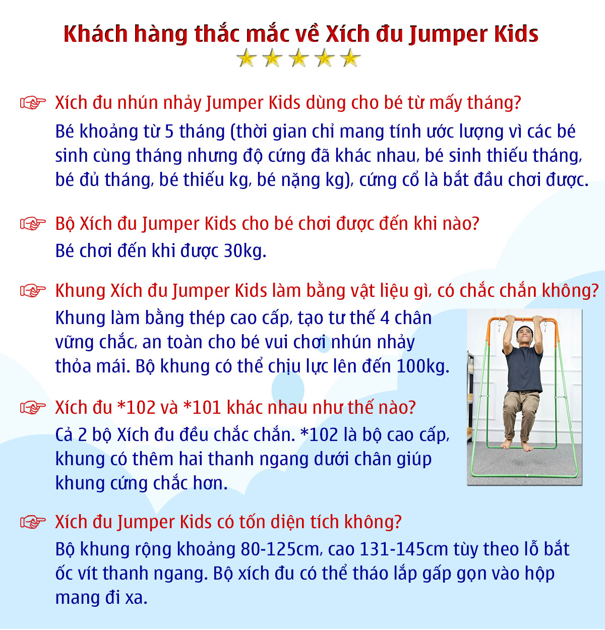 Khung Xích Đu Jumper Kids được bảo hành chính hãng 2 năm, đảm bảo an toàn và chất lượng vượt trội.