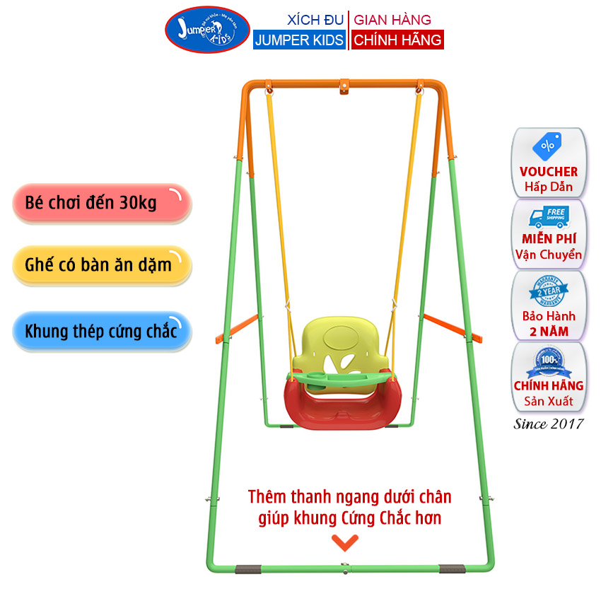 Xích đu cho bé Jumper Kids đa năng với bộ khung cao cấp, có 2 thanh ngang tăng cường dưới chân giúp khung xích đu cứng chắc hơn, chịu tải lên đến 100kg.